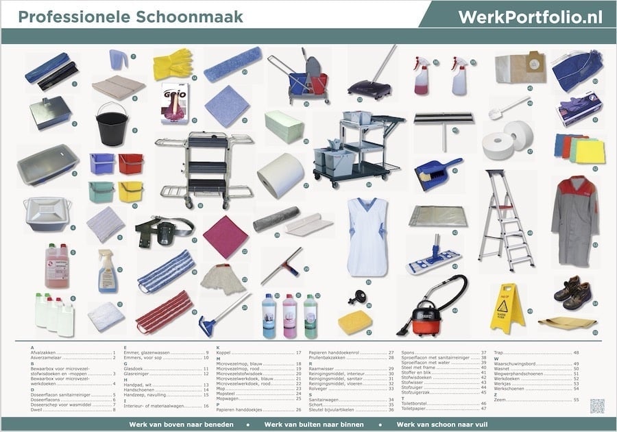 Op deze poster staan de materialen en gereedschappen van zowel PRO Schoonmaak als PRO Microvezel.